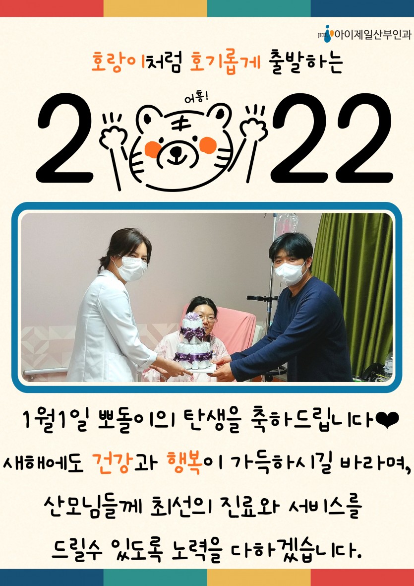 [아이제일소식] [아이제일산부인과] ❀ 2022년 새해 첫 아기 탄생을 축하드립니다 ❀ 작성일 : 2022.01.05 아이제일산부인과 댓글 : 0 조회 : 6,244 2022년 임인년 아이제일산부인과 새해 첫 아기, 새해둥이 탄생을 축하합니다 ❤